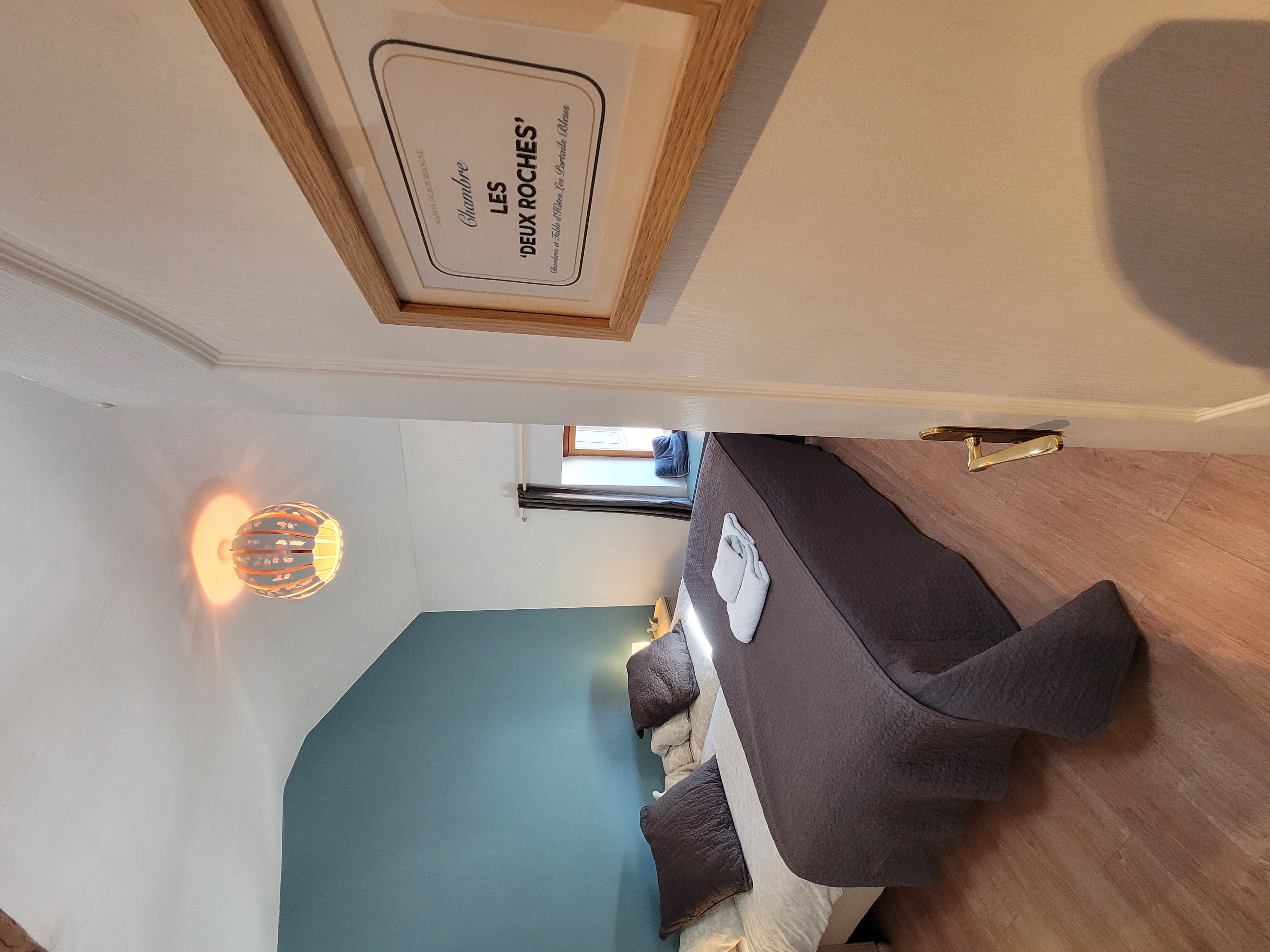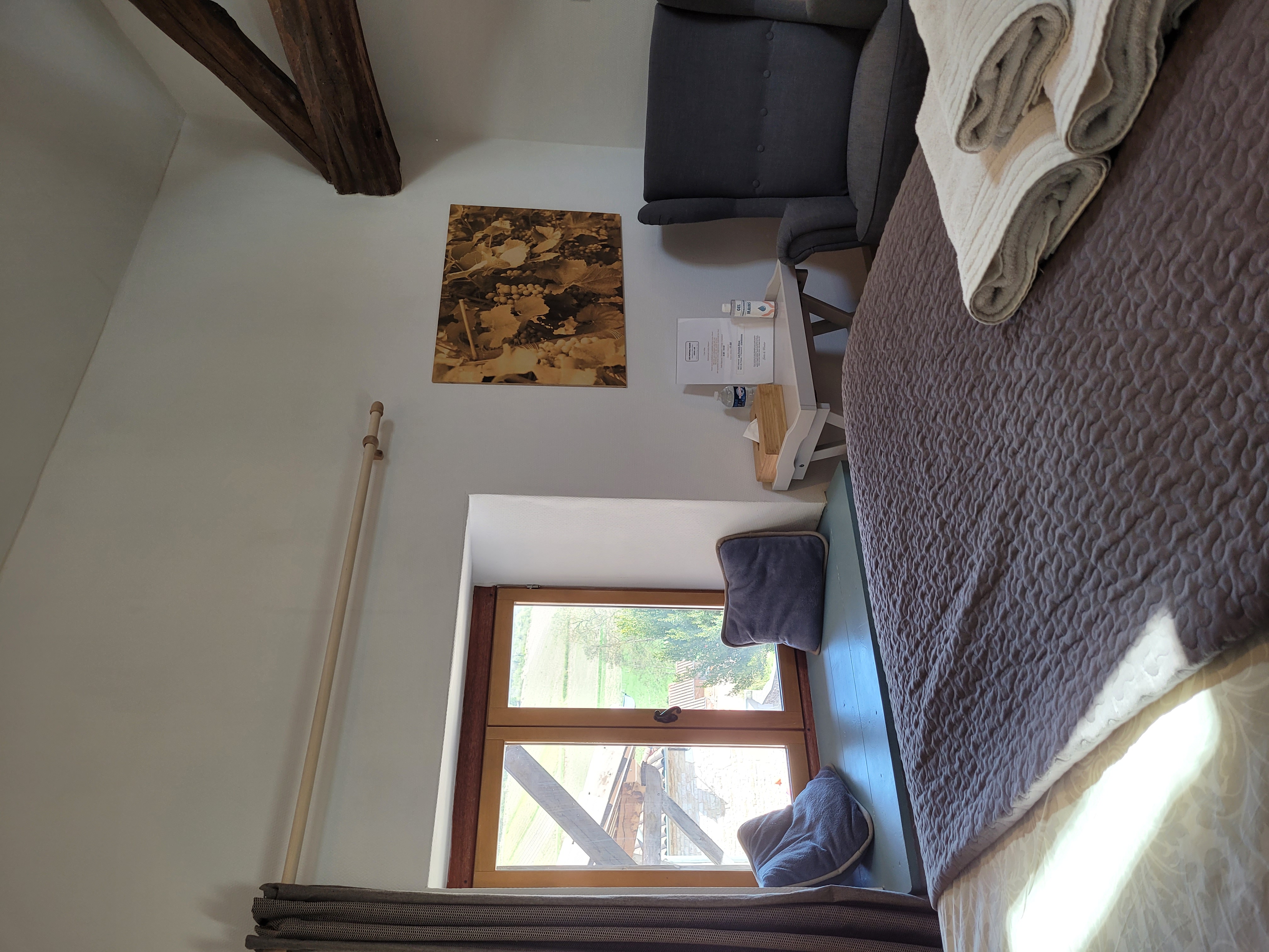 Our twin room  offers a seating area, an ensuited bathroom and exposed beams with a view over the courtyard and village vineyard.