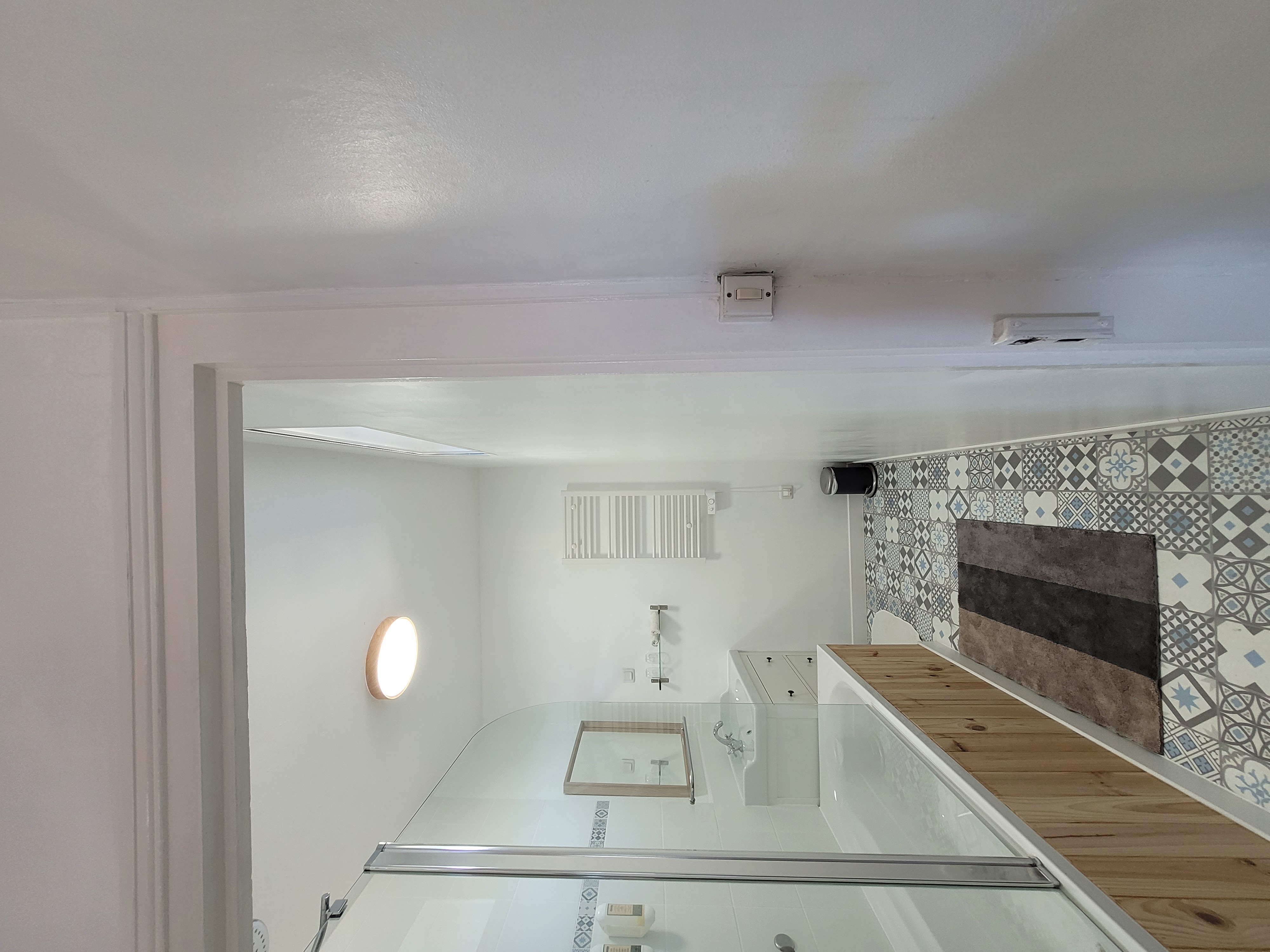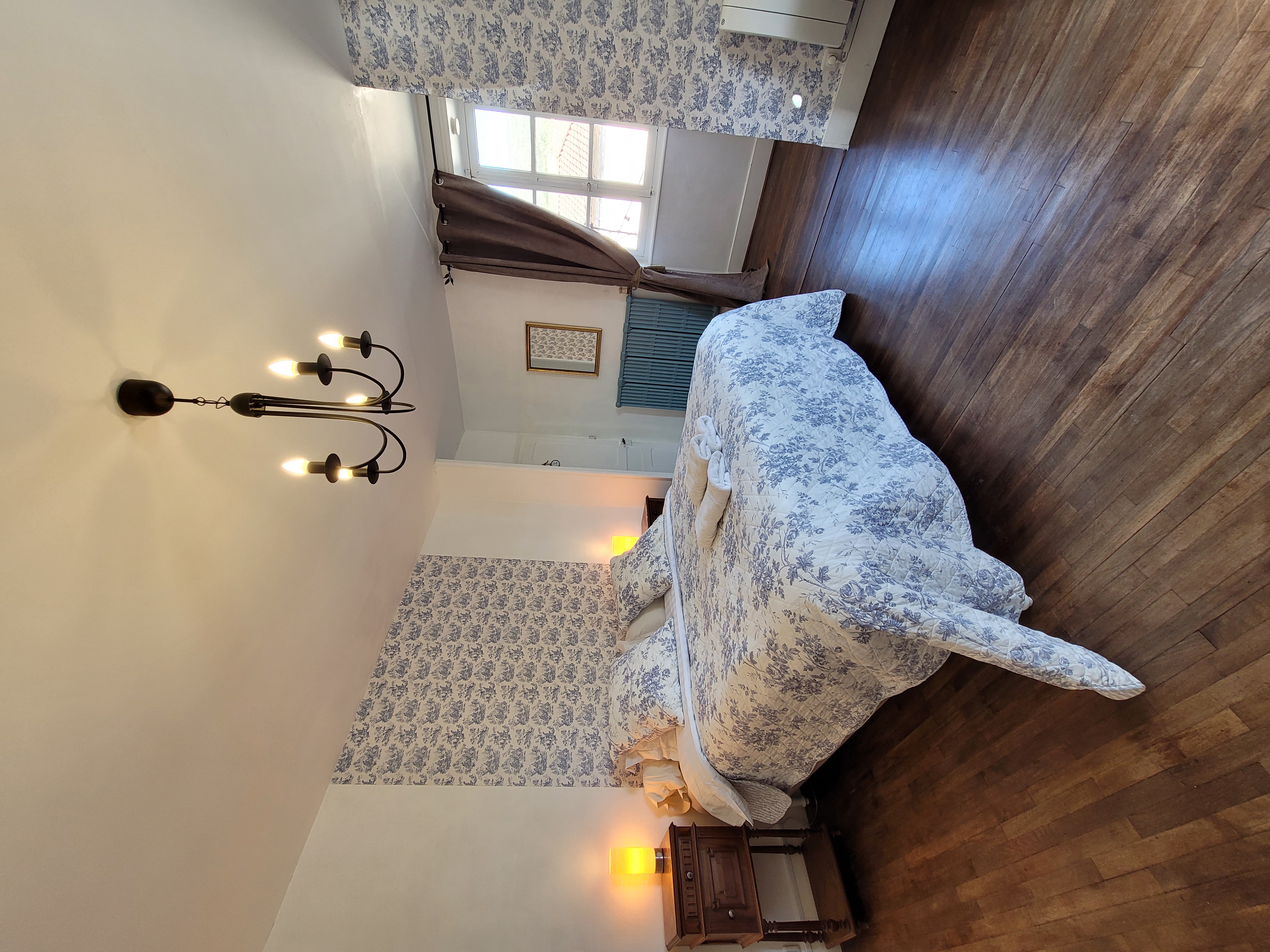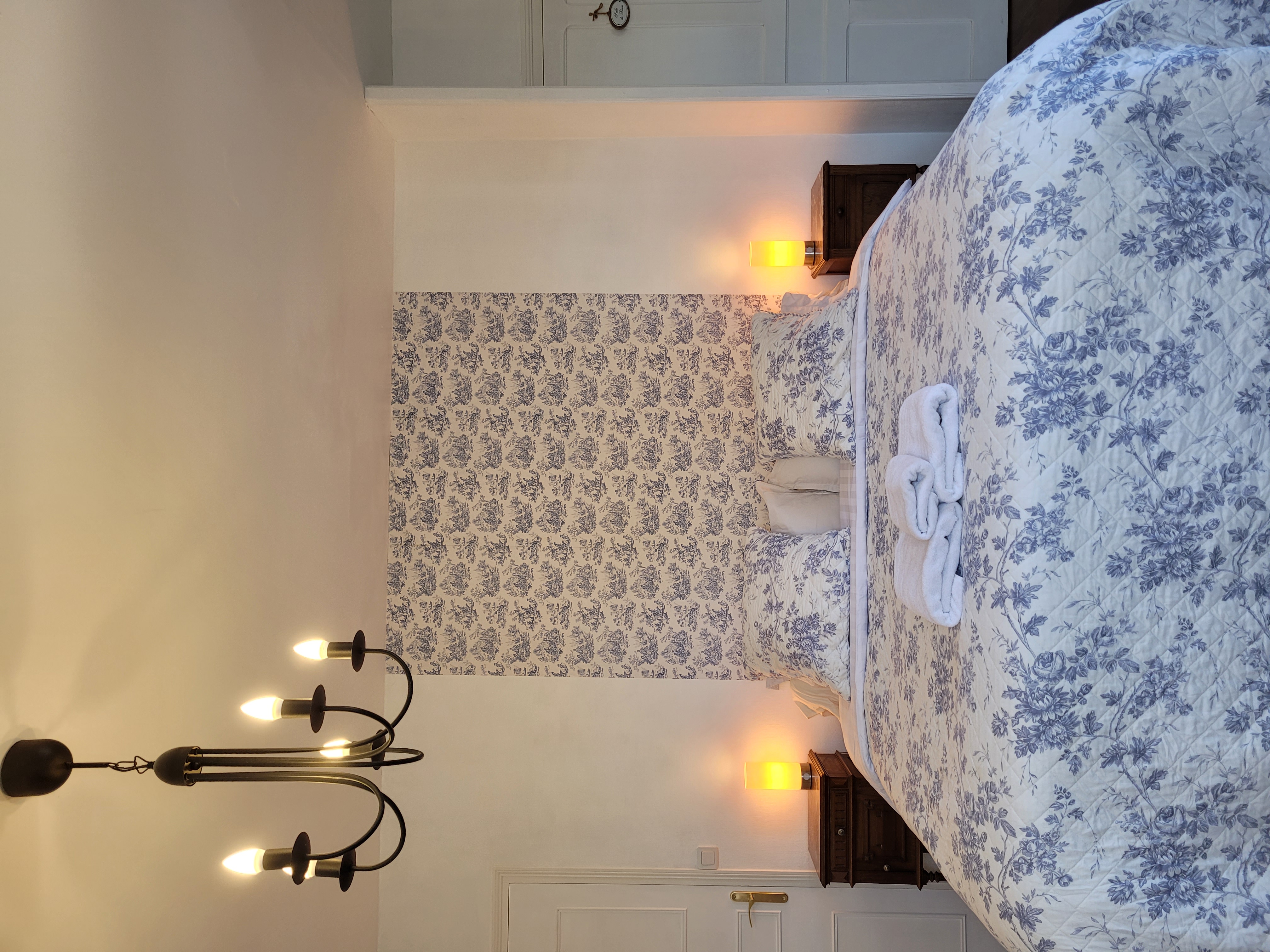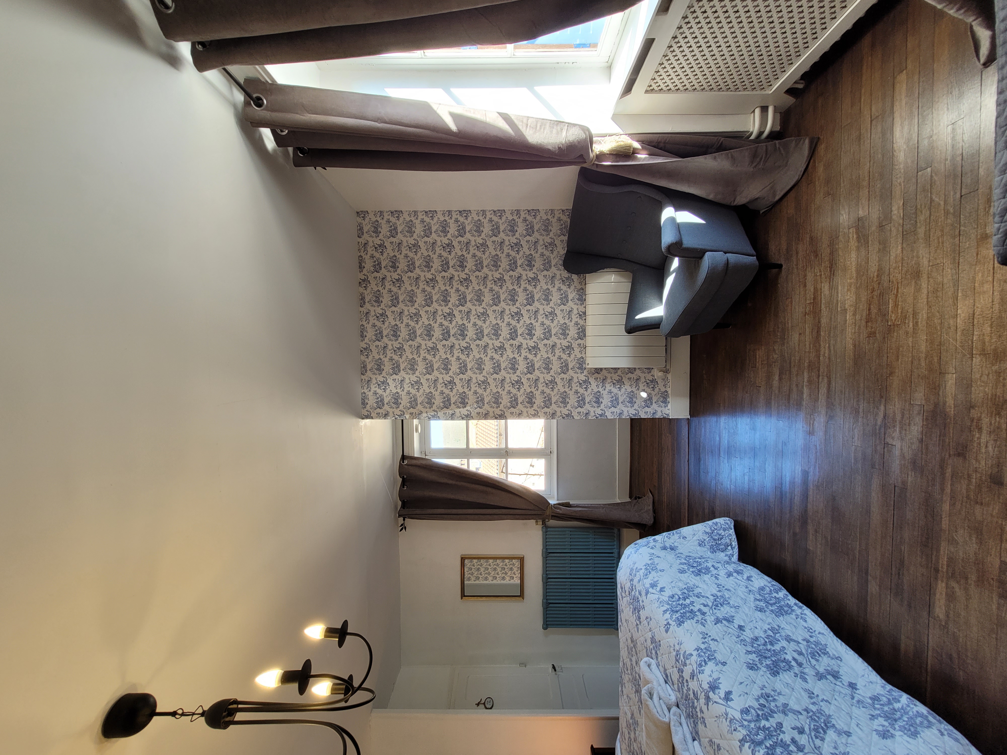 This room offers a king size bed and a sofa bed. A bathroom with bath and shower over and a toilet separate from the bathroom. This bright and sunny room offers a view over the courtyard and the village vineyards.