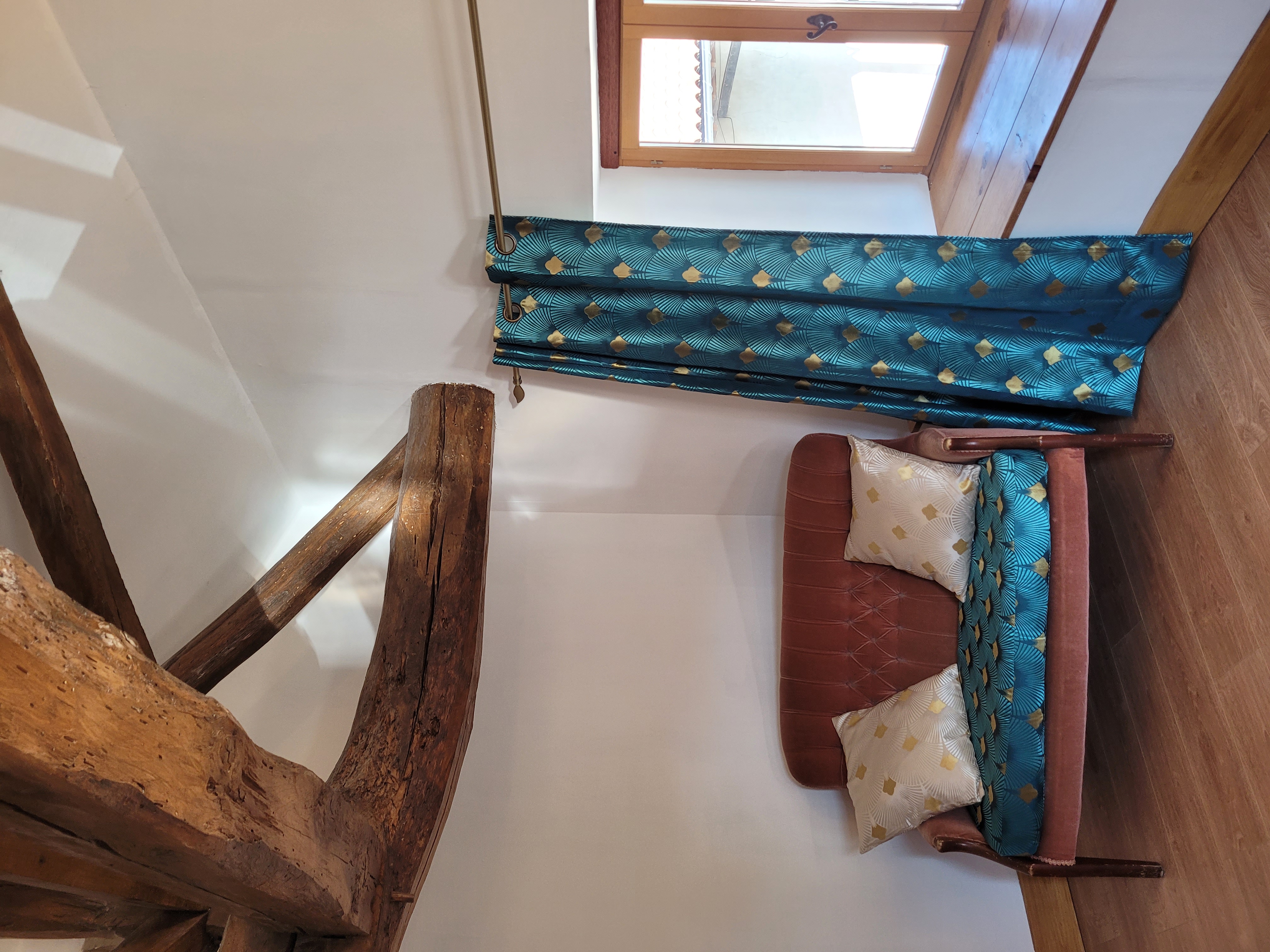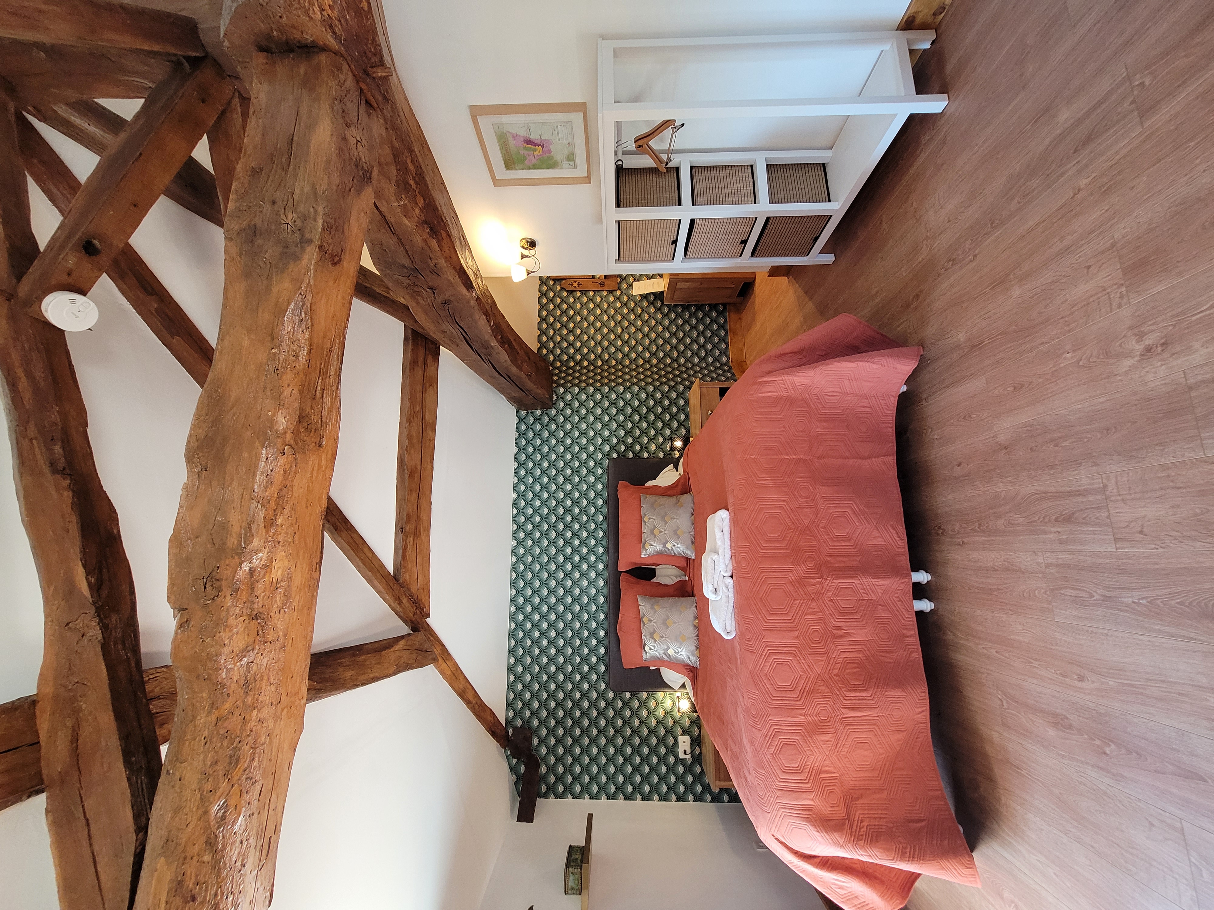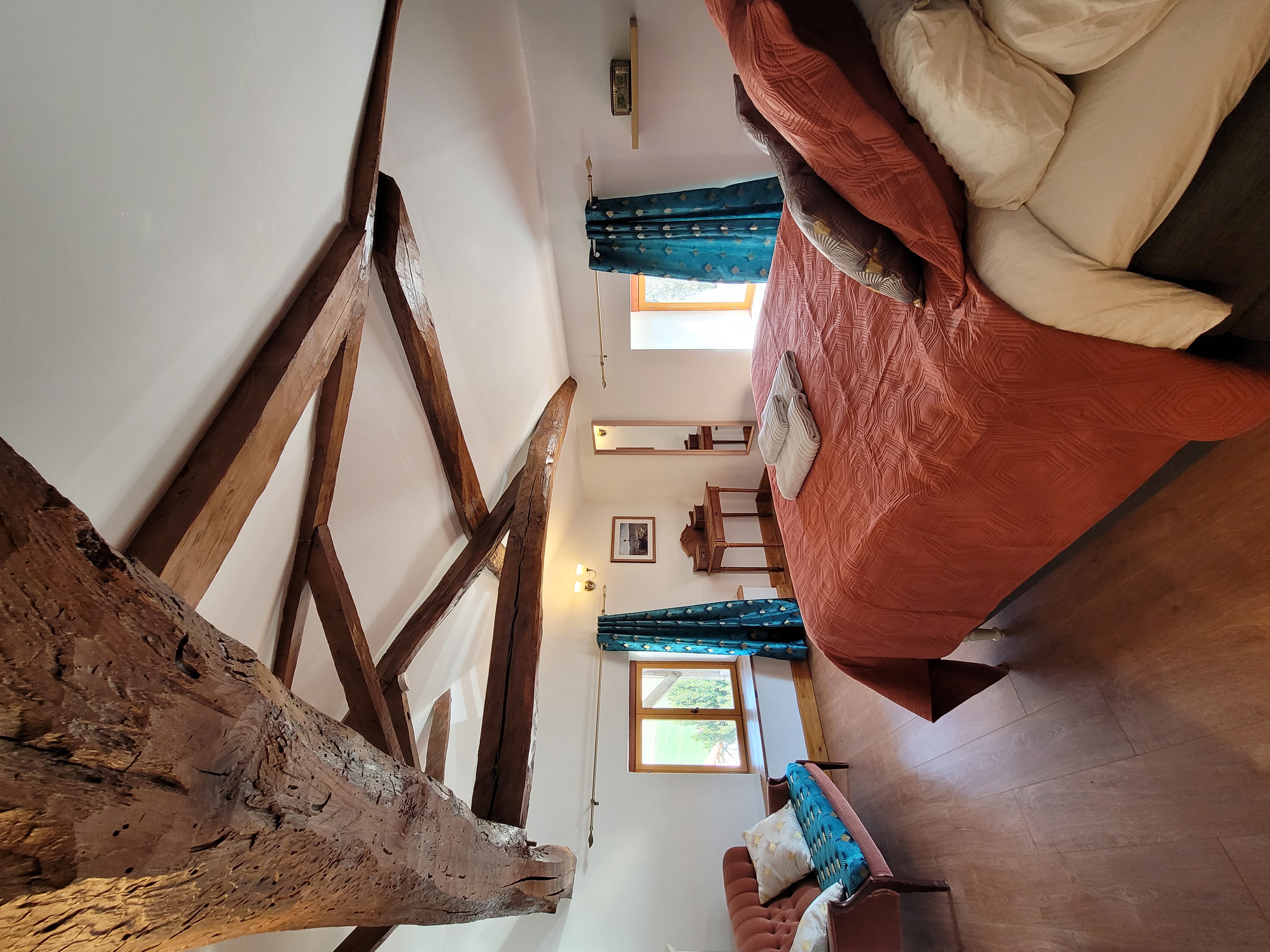 This spacious room has a king size bed, seating area, exposed beams and a bathroom. The double aspect windows face east and south, enjoying sunshine from early morning and throughout most of the day. You can enjoy a spectacular view over the village vineyards.